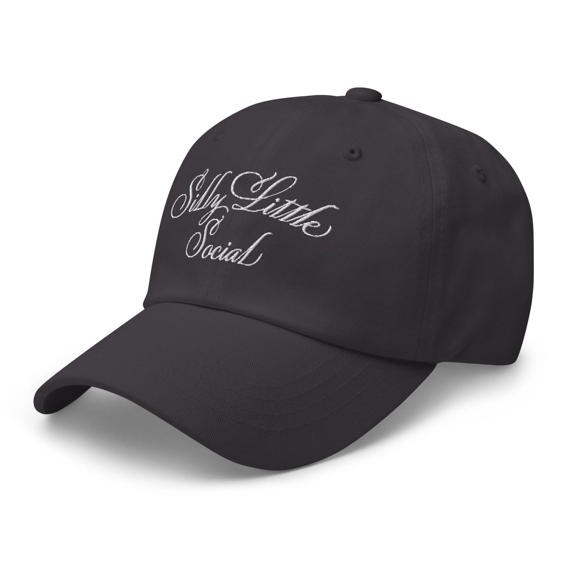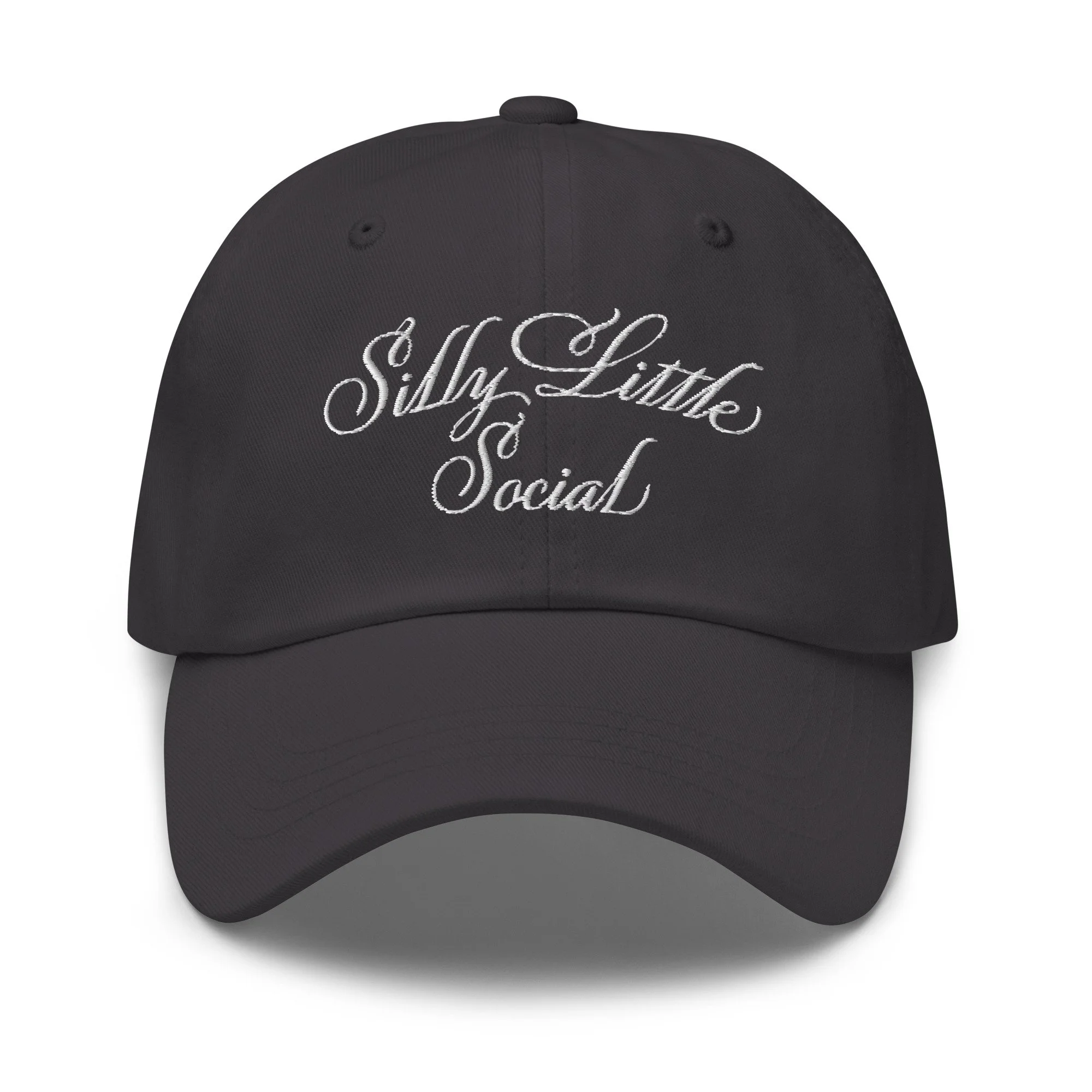 Merch › Silly Little Social Hat Image 1 of 12 Image 2 of 12 Image 3 of 12 Image 4 of 12 Image 5 of 12 Image 6 of 12 Image 7 of 12 Image 8 of 12 Image 9 of 12 Image 10 of 12 Image 11 of 12 Image 12 of 12 Silly Little Social Hat $30.00 Dad hats aren't just for dads. This one's got a low profile with an adjustable strap and curved visor. Color: Black Dark Grey Khaki Add To Cart Added! Dad hats aren't just for dads. This one's got a low profile with an adjustable strap and curved visor.